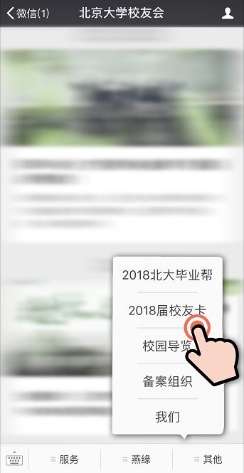 或关注“北京大学校友会”微信服务号(pkuorgcn),点击“其他”菜单中的“2018届校友卡”注册申请。