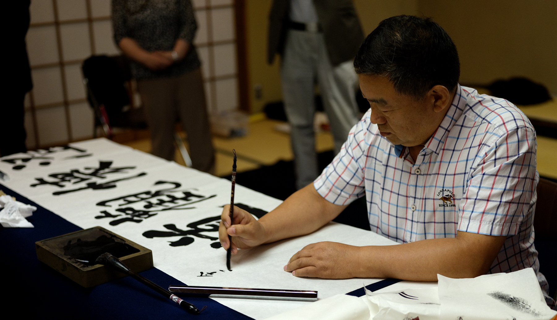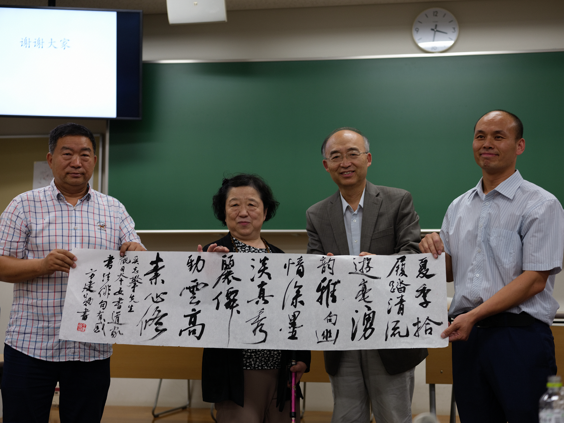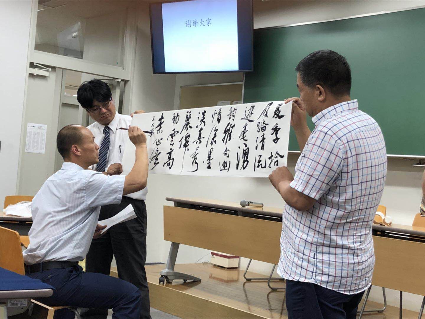 北京大学前常务副校长吴志攀教授现场赋诗,方建勋博士书写并赠武藏野大学书法教师新仓承子女士