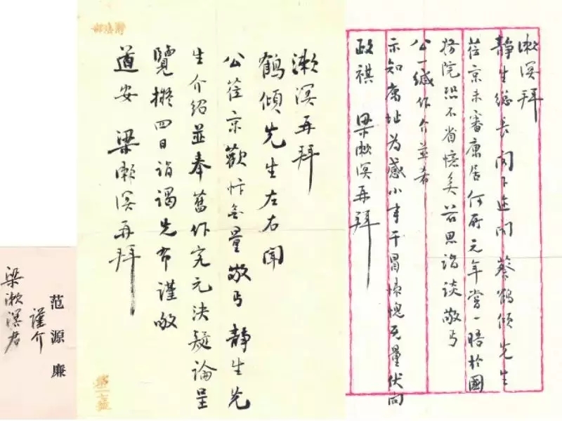 图为梁漱溟致范源濂(静生)、蔡元培(鹤卿)的信及引介名片。