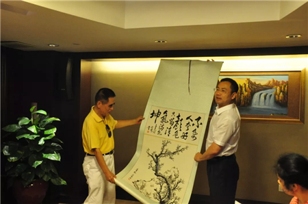 图说:刘萌会长代表北大湖北校友会赠送字画《梅花图》