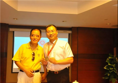 图说:广东校友会会长徐枢(左)向湖北校友会会长刘萌(右)赠送“北大赛中赛”奖牌