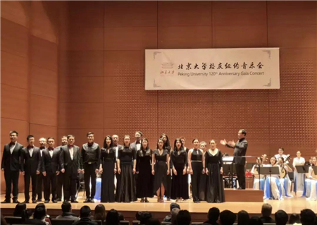 当晚的演出以《燕园情》作为开场。来自北京大学纽约校友会合唱团的校友身着纯黑礼服,在林肯中心舞台和灯光的映衬下格外优雅。“眼底未名水,胸中黄河月。”作为北京大学最广泛传唱的歌曲,《燕园情》的曲调一出,就牵起了在场校友深深的家国情、母校情。双甲子,北大情怀传承逾百年;越重洋,母校情谊不以山海远。身在万里之外的纽约,北大校友们依然心怀祖国心系母校,用自己的方式在世界之都为母校庆生。