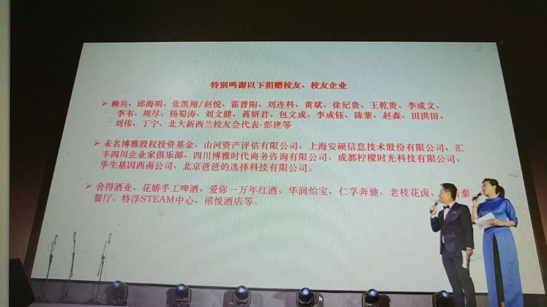 本次年会的成功举办离不开校友们的大力支持:北大四川校友会先后收到个人和企业的现金捐款27万余元;很多企业为年会提供了场地、餐饮、交通、奖品等支持;还有很多校友参与到组织策划、表演、志愿服务等工作中。北大校友团结的精神和精心服务的细节让名校联盟的各位友人纷纷点赞。