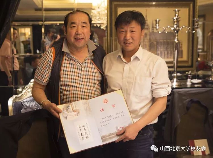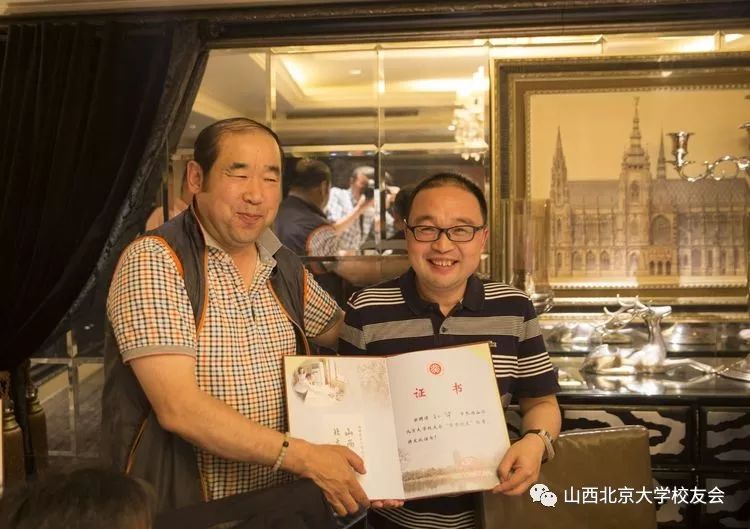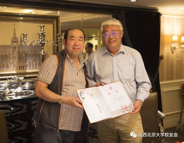 山西北大校友会范晋生会长向北大元培学院党委书记孙华、文博学院党委书记雷兴山、元培学院党委副书记丁夕友现场颁发了聘请以上三位校友为山西北大校友会‘’荣誉校友‘’的聘书。