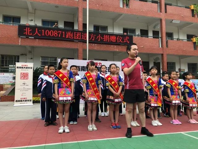 跑团从这里出发,一路向西南,到达第一站——大洞坪村方家屯中心小学,按照事先计划,向小学生赠送了早已准备好的文具。当地学生列队迎接,就像80年前,童子军迎接西南联大湘滇黔旅行团一样。