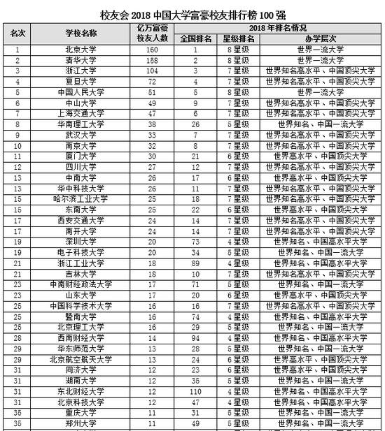 报告显示,在艾瑞深中国校友会网最新调查的1999-2017年福布斯、新财富等中国四大富豪榜上榜亿万富豪企业家中,即将迎来120周年校庆的北京大学培养造就了160名亿万富豪校友,雄居校友会2018中国大学富豪校友排行榜榜首。清华大学158人,屈居第2;北京大学、清华大学培养中国亿万富豪校友人数遥遥领先其他高校,是目前中国大学创新创业教育质量最高、校友商业成就最高的大学,堪称“中国亿万富豪摇篮”,是2018年全国高考立志将来经商创业、有志于成为企业家和商界精英的优秀考生的最佳选择。浙江大学104人,居第3;复旦大学72人,列第4;中国人民大学51人,居第5;中山大学49人,列第6;上海交通大学47人,居第7;华南理工大学38人,列第8;武汉大学33人,居第9;南京大学32人,居第10。