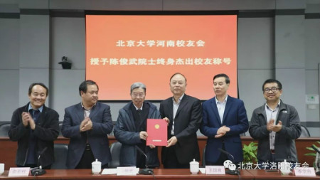 会上播放了北大洛阳校友会为迎接北大百廿华诞录制的专题片,这个专题片集中展现了洛阳校友在地方社会经济发展中所取得的突出贡献。中科院院士北大校友陈俊武为我国炼油工业做出了杰出贡献,是全球30万北大人的杰出代表,为北大增光添彩,李文胜秘书长向陈俊武院士颁发“河洛英模”奖,北大河南校友会会长薛德星向陈俊武院士授予“终身杰出校友”称号。