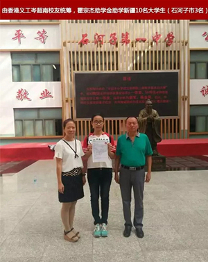 8月26日,全国高校开学前夕,新疆五个地(州)市13名各族大学贫困新生,同时获得香港北京大学助学基金会和香港霍宗杰先生的助学基金,消除了揪心的求学困境,直接感受到香港同胞和北大校友组织的殷切希望。大家一致表示:一定不忘香港同胞和北大学子恩典,在校刻苦学习,学成报效祖国,投身中华民族伟大复兴中国梦的奋斗中。