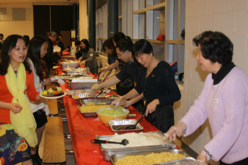 除了舞台上校友自编自演的节目,北大清华春晚从来就是一场美食的盛宴和一次结交新朋、重会旧友的好机会。这次晚会的食品,是南方和北方风味兼顾,主打有机和美味食品,包括苔条魚片、重庆辣子鸡、宫保脆皮蝦、尖椒肉丝、排骨豆腐煲、雪菜白叶毛豆,更有来自校友农场的大葱炒土鸡蛋、校友烤制的有机南瓜条、校友调制的川味麻辣凉面,还有清华和北大食品组分头准备的两个不同版本的黄瓜丝和北京炸酱面。同窗校友也好,同年不同校校友也好,不同年校友也好,大家一起共享天南海北的家乡美食,一同欢度佳节,共叙情谊, 其乐融融。