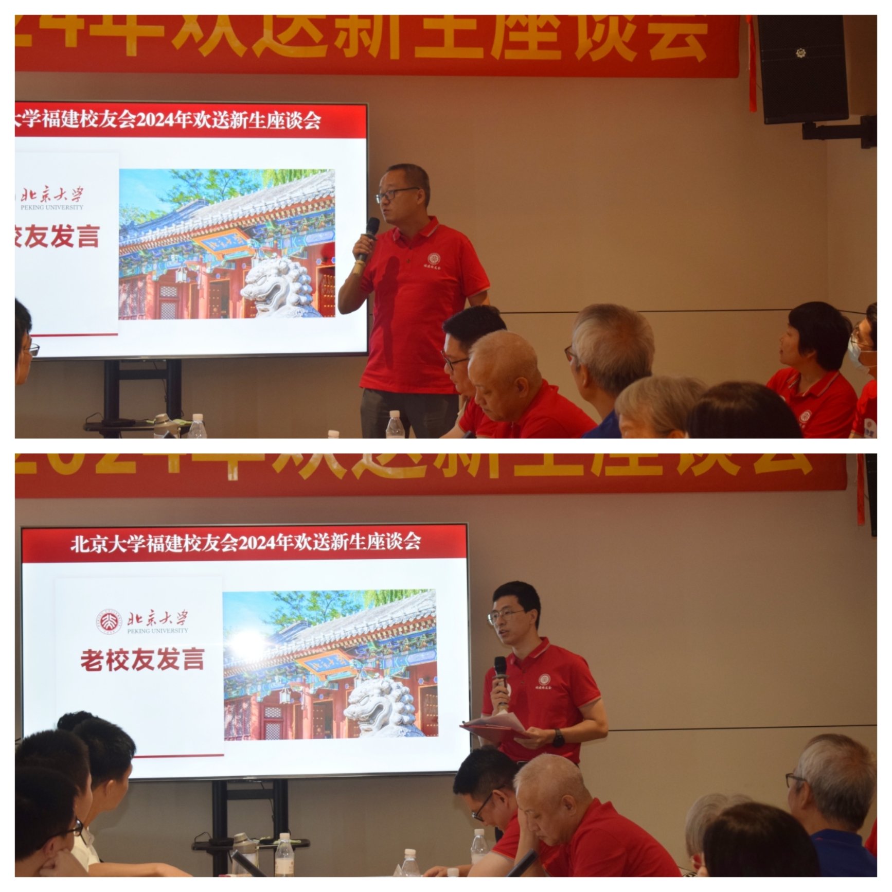随后,新生们逐一做自我介绍,他们充满青春活力、幽默自信,展现了新北大人广泛的爱好与明媚的个性,欢乐的气氛在北大人之家荡漾。5位新生代表分享了各自圆梦燕园的心路历程:郑佳宸同学感慨梦想终于照进现实;陈天天同学期待自由探索学海的无限可能;王恒毅同学呼吁24级新生积极承担新时代背景下北大人的独特角色,引领科研突破与国家进步;即将入读化学与分子工程学院的潘宇辉同学则将八闽大地绵长的山峦化为前行的动力,渴望高峰之上再创辉煌,将八闽学子之名镌刻在最高学府的长卷中。老校友们不禁为之动容,“生于山海,回归八闽”的福建北大人在此刻见证了梦想相继、血脉相承、校友相依的思想光华。