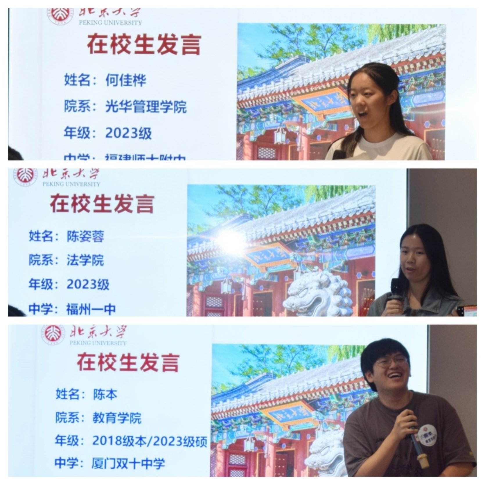 为满足新生想了解学校近况的需求,校友会特邀了三位闽籍在读同学——即将大二的何佳桦、陈姿蓉和研二的陈本同学与学弟学妹们进行了互动对话。分别就选课策略、学业安排和职业规划等方面提出建议,并解答了新生们关于校园生活的疑惑,期待与今年的每一位新北大人相约未名、相聚未来,共同创造属于福建北大人的漫天星辰。