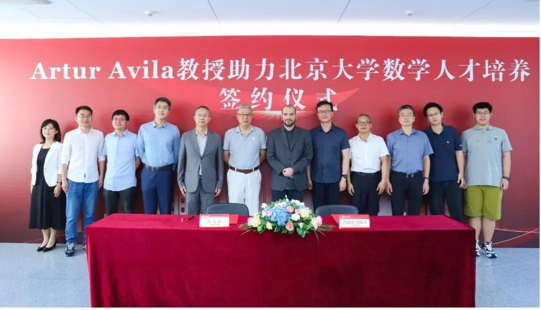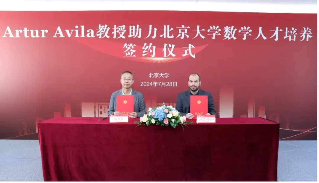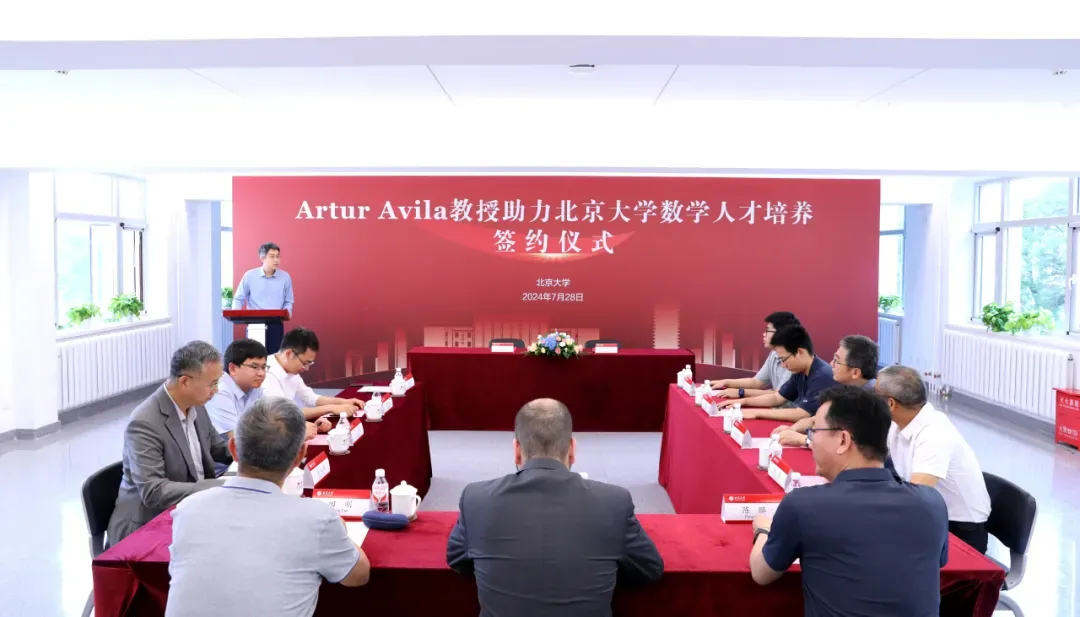 2024年7月28日下午,Artur Avila教授助力北京大学数学高层次人才培养签约仪式在北京大学智华楼四元厅举行。菲尔兹奖得主、著名数学家Artur Avila正式签约北京大学,受聘成为北京大学数学研究生拔尖人才培养计划国际顾问专家。中国科学院院士、北京大学讲席教授、北京国际数学研究中心主任田刚,北京大学研究生院常务副院长陈鹏,数学科学学院院长陈大岳,党委书记胡俊,副院长孙赵君、刘若川、丁剑以及研究生拔尖计划导师、学生代表等参加签约仪式。仪式由刘若川主持。