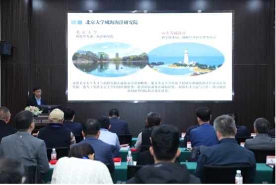 丁烨首先对山东省北京大学校友会一行的到来表示热烈欢迎,并对研究院的定位与使命、发展思路及目前正在推进的项目等进行了详细的介绍。北京大学威海海洋研究院自2021年4月29日正式成立以来,聚焦海洋领域,重点围绕威海海洋领域科技与产业发展需求,集聚国内外创新型智力资源,开展综合性海洋规划与发展研究。研究院作为承接北京大学人才与科技资源在威海市引进和孵化的高端载体、服务北京大学涉海学科研究和威海海洋经济高质量发展的高水平创新平台,致力于发挥北京大学科创资源优势,促进科技成果在威海转化,加强人才交流与合作,助力威海市创新型国际海洋强市建设。自去年领导班子换届以来,研究院更加重视科技成果的落地转化,并将其作为推动发展的关键。在队伍建设方面,研究院管理团队均来自北京大学。在基础设施建设方面,研究院实验楼先进材料与应用实验室(二层)已竣工并投入使用,实验设备现已正式启动并平稳运行。在科技成果转化方面,研究院于第一届管理委员会第二次会议上明确界定了三大工程项目方向:生命与健康、技术与海洋、文化与交流。2024 年取得了显著进展,不仅成立了威海威名科技创新有限公司这一平台运营实体,还成功孵化出高新技术企业——寒序科技(山东)有限公司,并参加了第十三届中国创新创业大赛山东赛区暨 2024 年“建行创业者港湾”山东省中小微企业创新竞技行动计划威海初赛路演。积极推动智能水下作业与智慧海洋牧场、无人系统在船舶领域应用、高压磁耦合推进器研制与应用癌症转移阻断技术等 10 余个科研项目。在学术交流领域,研究院精心设立了“北京大学红楼”、“博雅”、“厚道”及“未名”系列讲座,并举办了“企业合规研讨会”、“首届磁学与磁性材料发展研讨会”及“项目推进研讨会”等多场专业论坛,此外还成功组织了一系列高端交流活动。在人才培养方面,与刘公岛管理委员会及中国甲午战争博物院签署了合作协议,共同建设了北京大学爱国主义教育基地,打造了北大本科生实习基地,积极协助北京大学海洋研究院在威海经济技术开发区设立了北京大学涉海领域教学实践基地试点。
