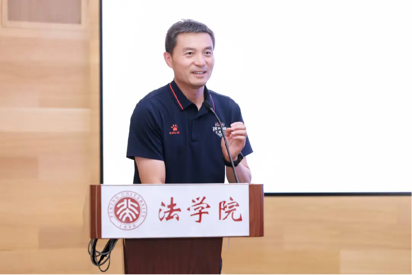 随后,钱俊伟主任致辞。他总结了法学院师生校友多年来对北大体育事业的杰出贡献,高度赞扬法学院在高水平运动员人才培养与校友体育工作的引领作用。特别是在国内外重大赛事、登顶珠峰、促进马拉松运动、推进北大足球发展等领域,均能看到北大法律人的身影。长期以来,法学院有着浓厚的运动氛围,希望未来以体育工作为纽带,进一步加强体育教研部与法学院的合作,共同推动北大体育事业发展。