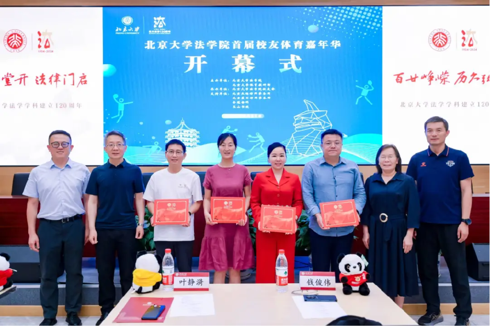 承百廿风华,谱法苑华章。为庆祝北大法学学科创建120周年,北京大学法学院、北京大学体育教研部共同举办北京大学法学院首届校友体育嘉年华系列赛事。2024年6月28日,开幕式在凯原楼报告厅隆重举行。北京大学校务委员会副主任、校友会常务副会长叶静漪,北京大学体育教研部主任钱俊伟,北京大学校友工作办公室副主任李存峰,北京大学法学院院长、党委书记郭雳,副院长朴文丹、车浩、刘哲玮、戴昕,以及来自全国各地的校友代表五十余人出席开幕式。活动由北京大学法学院党委副书记路姜男主持。
