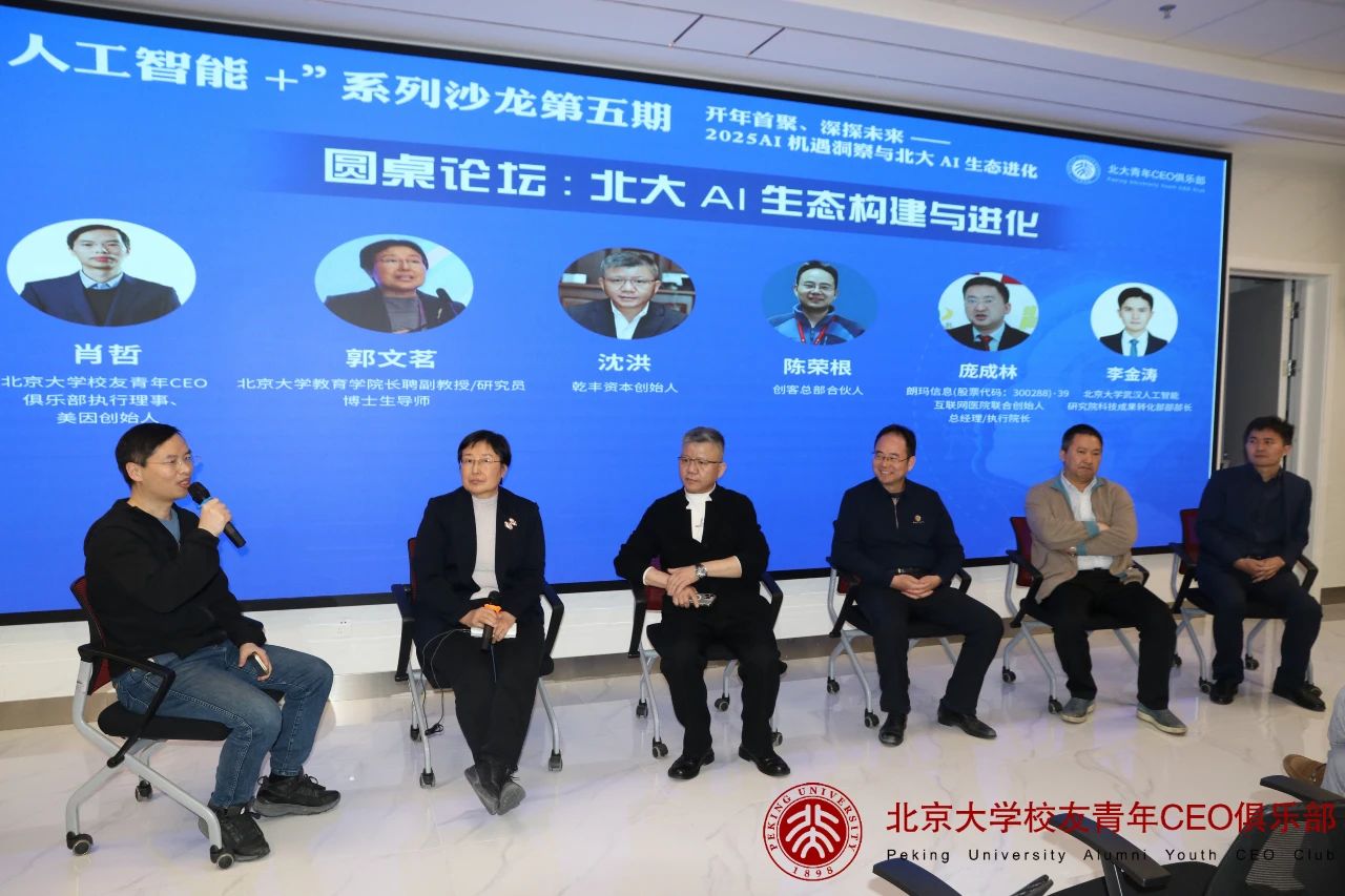 “北大AI生态构建与进化”圆桌论坛由北京大学校友青年CEO俱乐部执行理事、美因创始人肖哲主持,北京大学教育学院长聘副教授/研究员、博士生导师郭文茗,乾丰资本创始人沈洪,创客总部合伙人陈荣根,朗玛信息(股票代码:300288)·39互联网医院联合创始人总经理/执行院长庞成林,北京大学武汉人工智能研究院科技成果转化部部部长李金涛等嘉宾围绕北大在AI领域的潜力和挑战、跨学科合作、产学研结合、北大AI生态构建等方面进行了深入讨论。