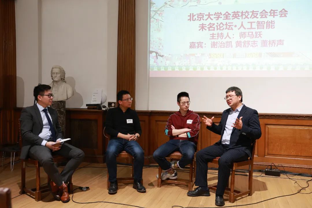 人工智能论坛由2013级信息工程学院校友师马跃主持,2001级国际关系学院校友、资深对冲基金投资经理谢治凯,2007级信息科学技术学院校友、AMMO AI CEO黄舒志,以及2003级医学部校友、Capsea创始人董桥声,分别围绕AI时代的投资、创业及历史哲学角度展开深入讨论。