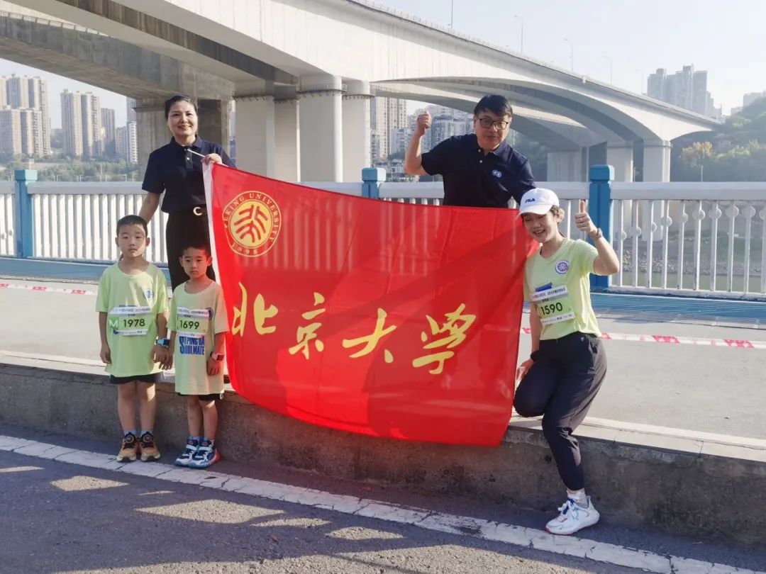 特别引人注目的是,2017级光华管理学院蔡润维、2019级外国语学院杨睿两位重庆籍校友专程从北京返渝参赛。“用脚步丈量家乡土地,用汗水致敬燕园精神”,蔡润维在完成半程马拉松后动情地说。在渝校友,2009级新闻传播潘先珮不仅积极报名参赛,还为北大参跑团购买了北大标志贴;2003级医学和国际关系专业周滢滢如今已是两个孩子的宝妈,今天她带着两个孩子十分享受地参赛。不同校友加入参跑团体现了北大校友对母校精神的地域传承。