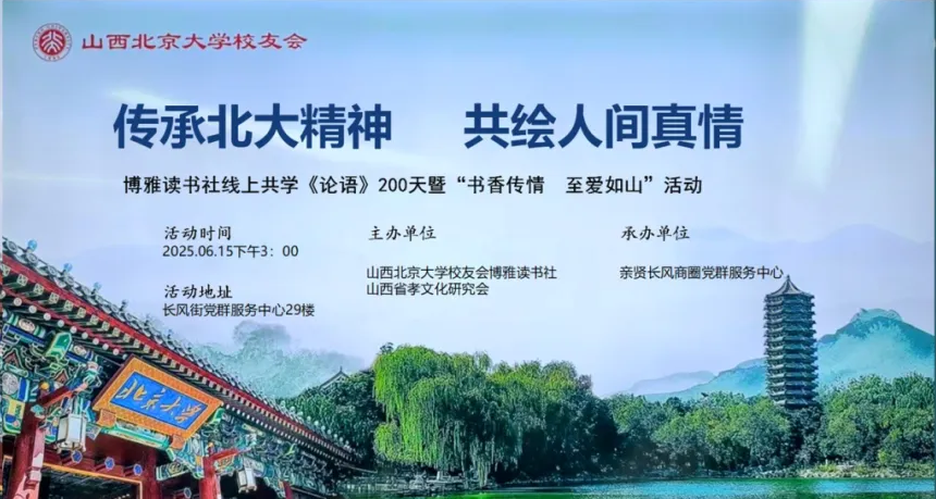 6月15日,山西北京大学校友会博雅读书社举办“线上共学《论语》200天暨‘书香传情 至爱如山’”活动。 北京大学校友会理事、山西北京大学校友会会长范晋生,山西北京大学校友会副会长梁东盛,副秘书长兼学雷锋服务团团长何作冻,书画院院长李戬兰,山西省孝文化研究会秘书长杜颖娜,山西省传统文化研究会副秘书长郭子琴等参加活动。大家齐聚一堂,在经典的浸润与深情的传递中,洋溢着浓郁的书香与温情,共同展开一场跨越时空的文化传承活动。
