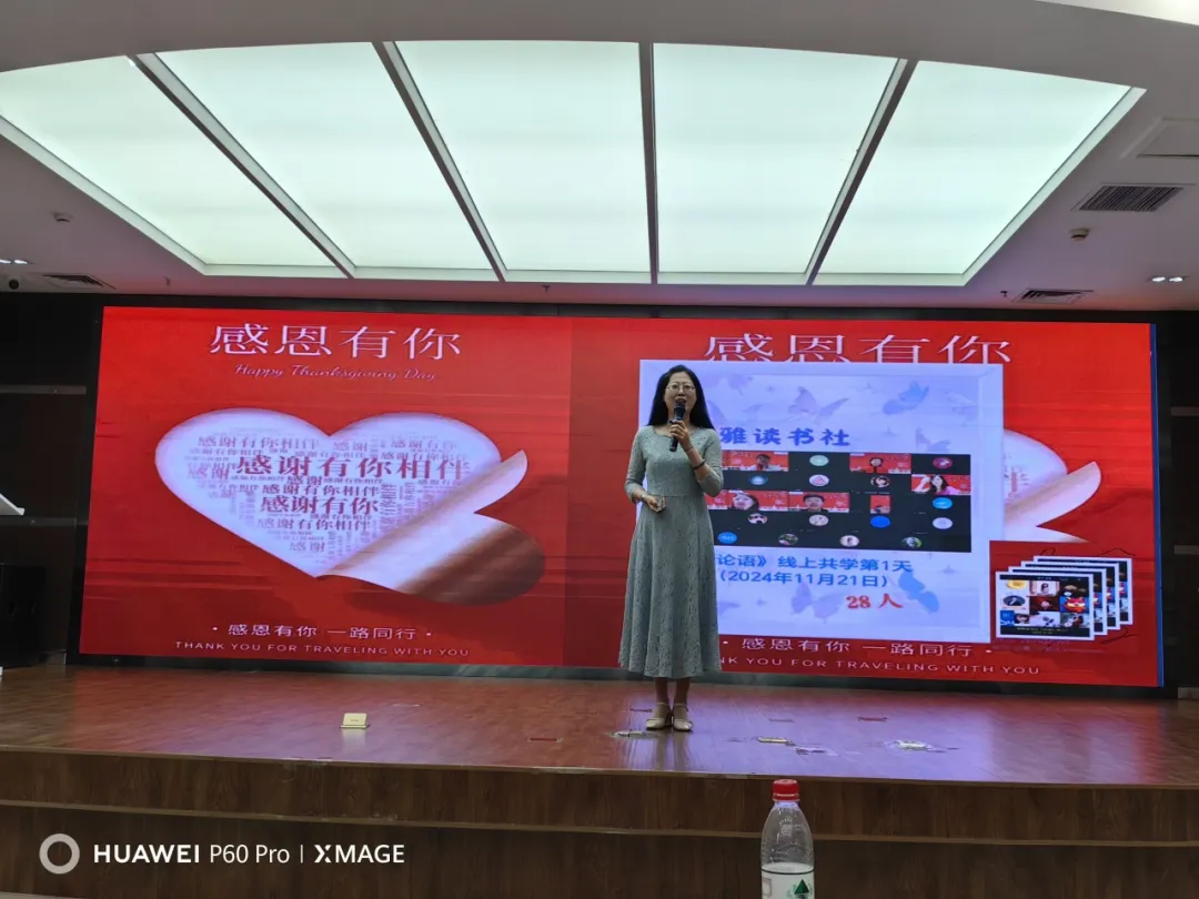 博雅读书社社长紫箫分享了线上共学《论语》200天的组织经验,梳理了读书社在组织共读、促进交流方面的主要工作,并进一步分享了学习体会。她围绕《论语》学习的核心价值、人生终极意义以及中国孝道的现代诠释等主题,发表了精彩的见解。