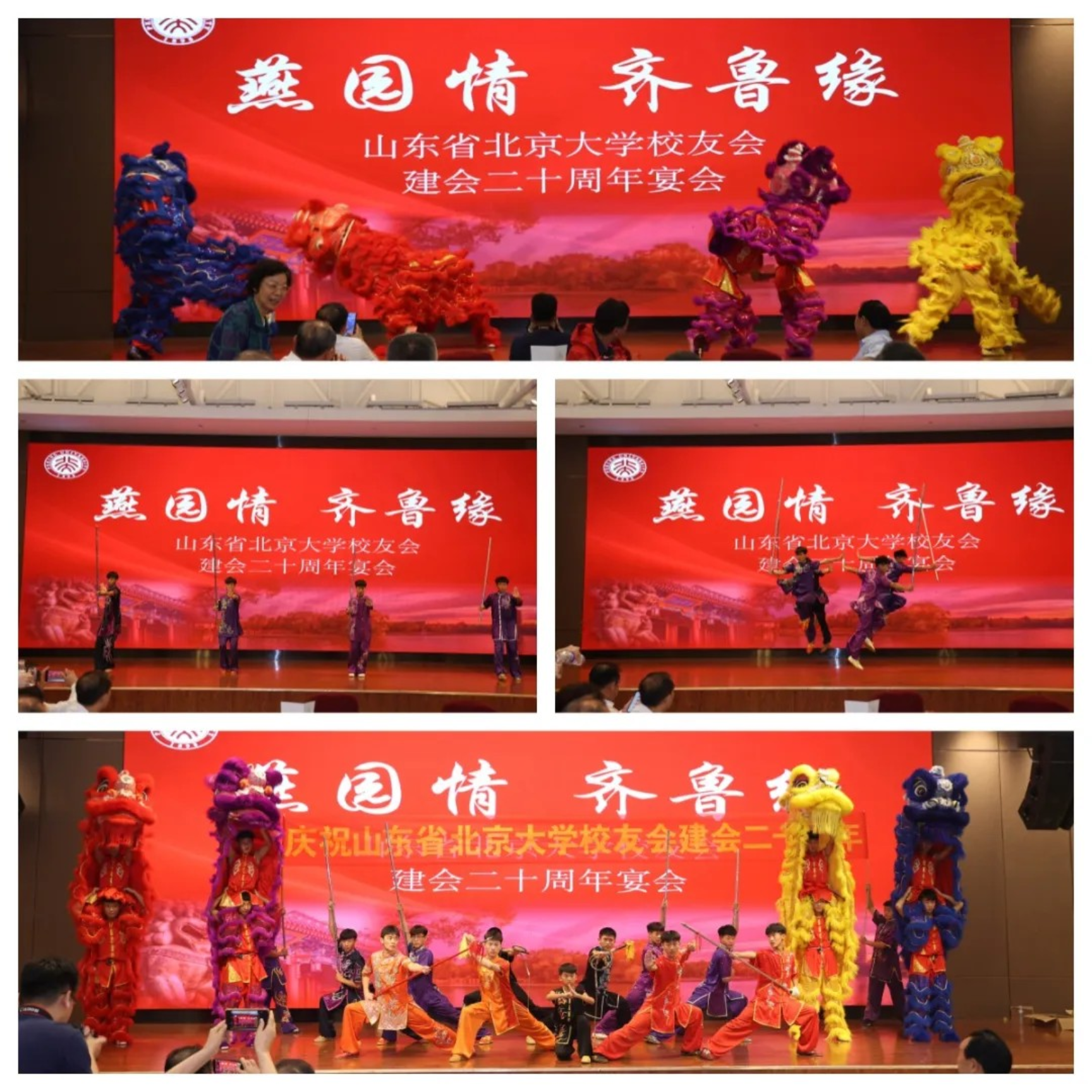 校友联谊环节,校友们准备了精彩的文艺节目。菏泽市曹州武术学院的学子们以让人赞不绝口的舞狮及武术表演烘托了热闹的现场氛围。北大校友会李文胜现场深情演唱《北大情》,表达了北大学子对母校的怀念和感激之情,让校友们回忆起在北大度过的美好时光。同时,校友高洁演唱《传奇》、光华拾光合唱团演唱《这世界那么多人》、董嘉蓉、曲翔前、曹君等倾情合唱《春风十里》《成都》、周翠英演唱《梨花颂》、姜伟演唱《人民》。