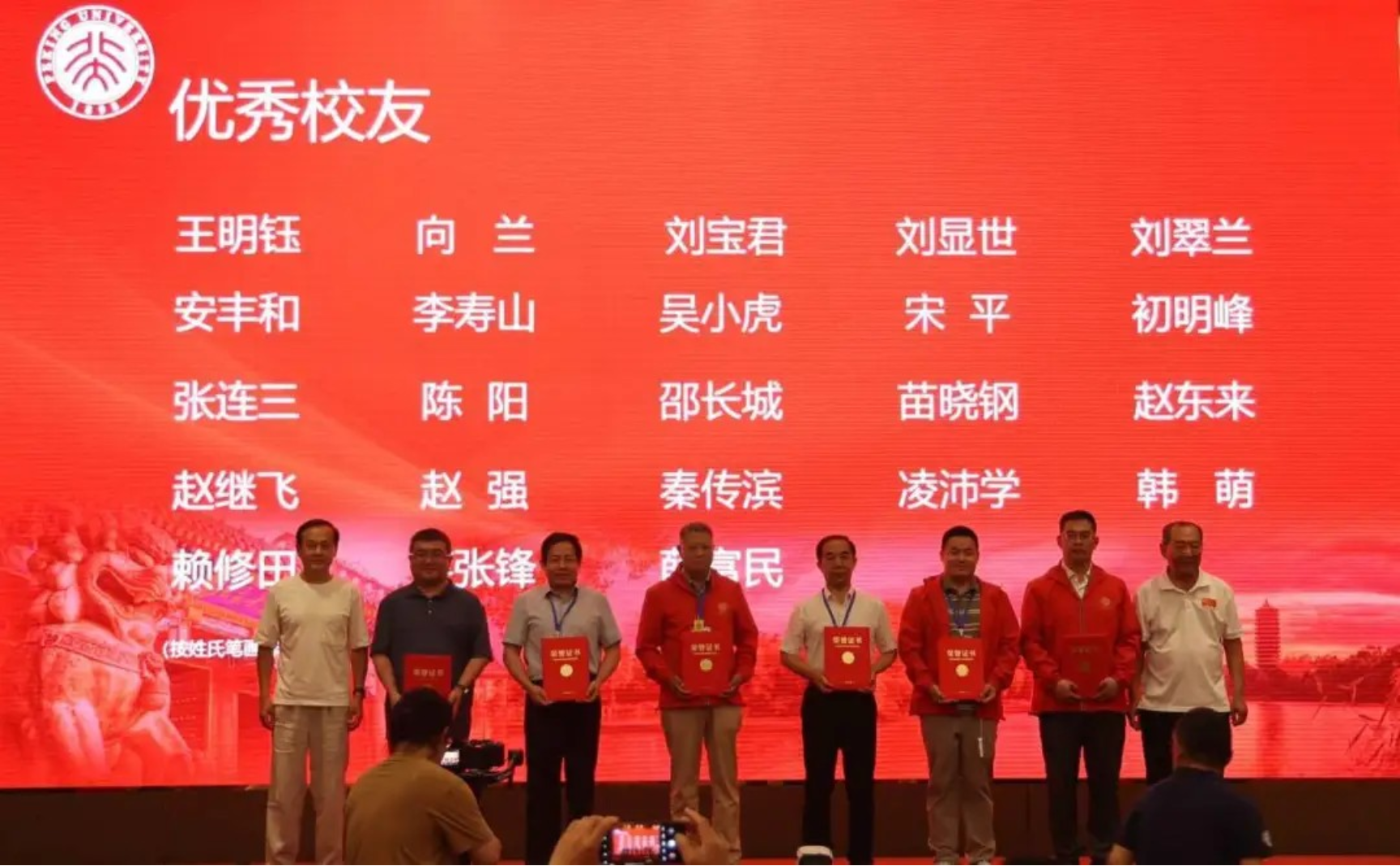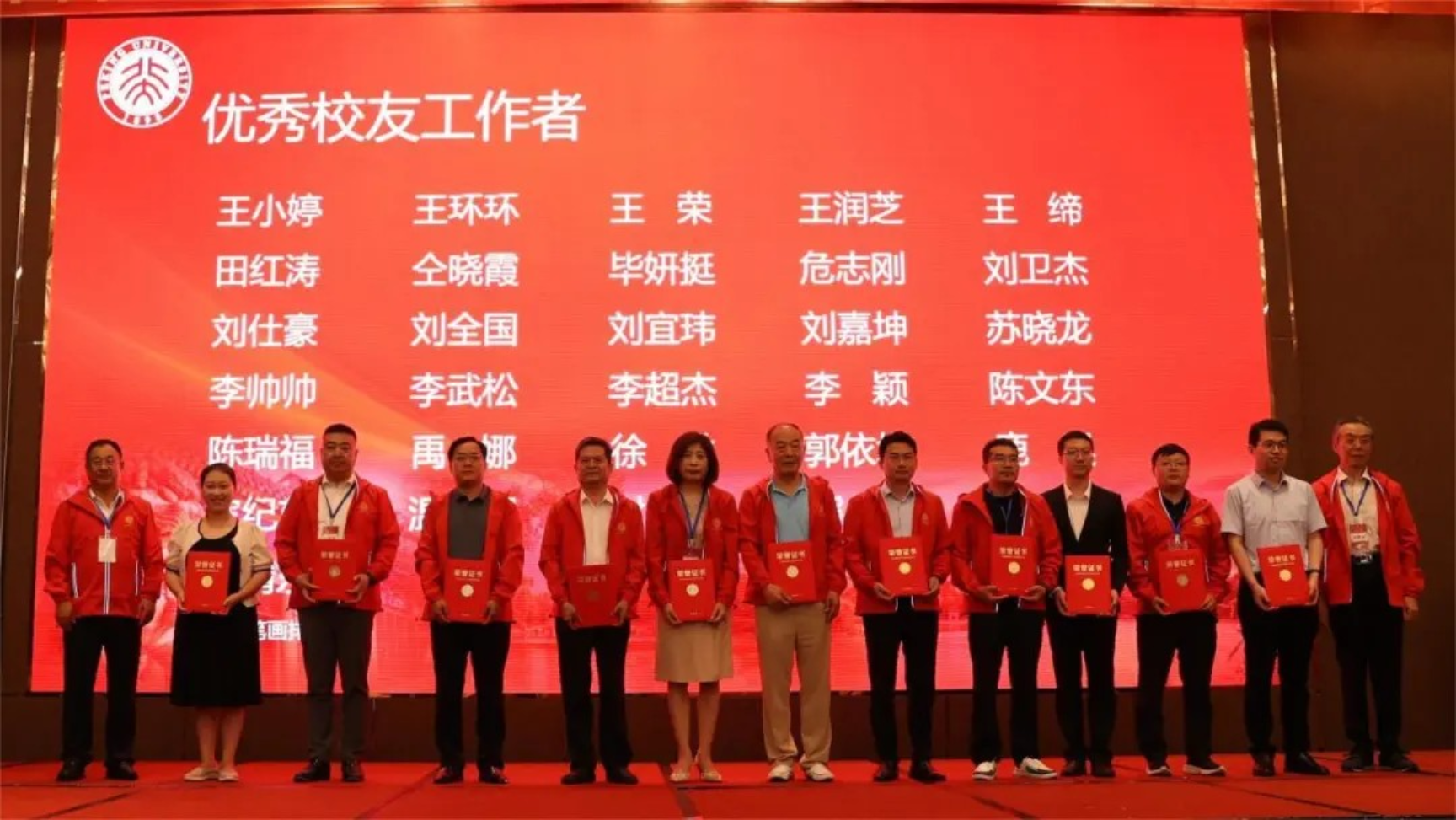 第一组领奖校友从左至右分别是:王润芝、刘卫杰、苏晓龙、刘全国、田红涛、毕研挺、李武松、马九林(代)、刘仕豪、李帅帅、危志刚