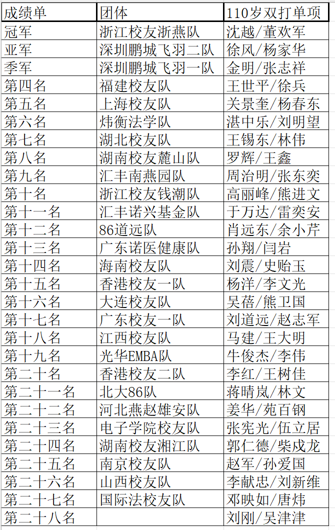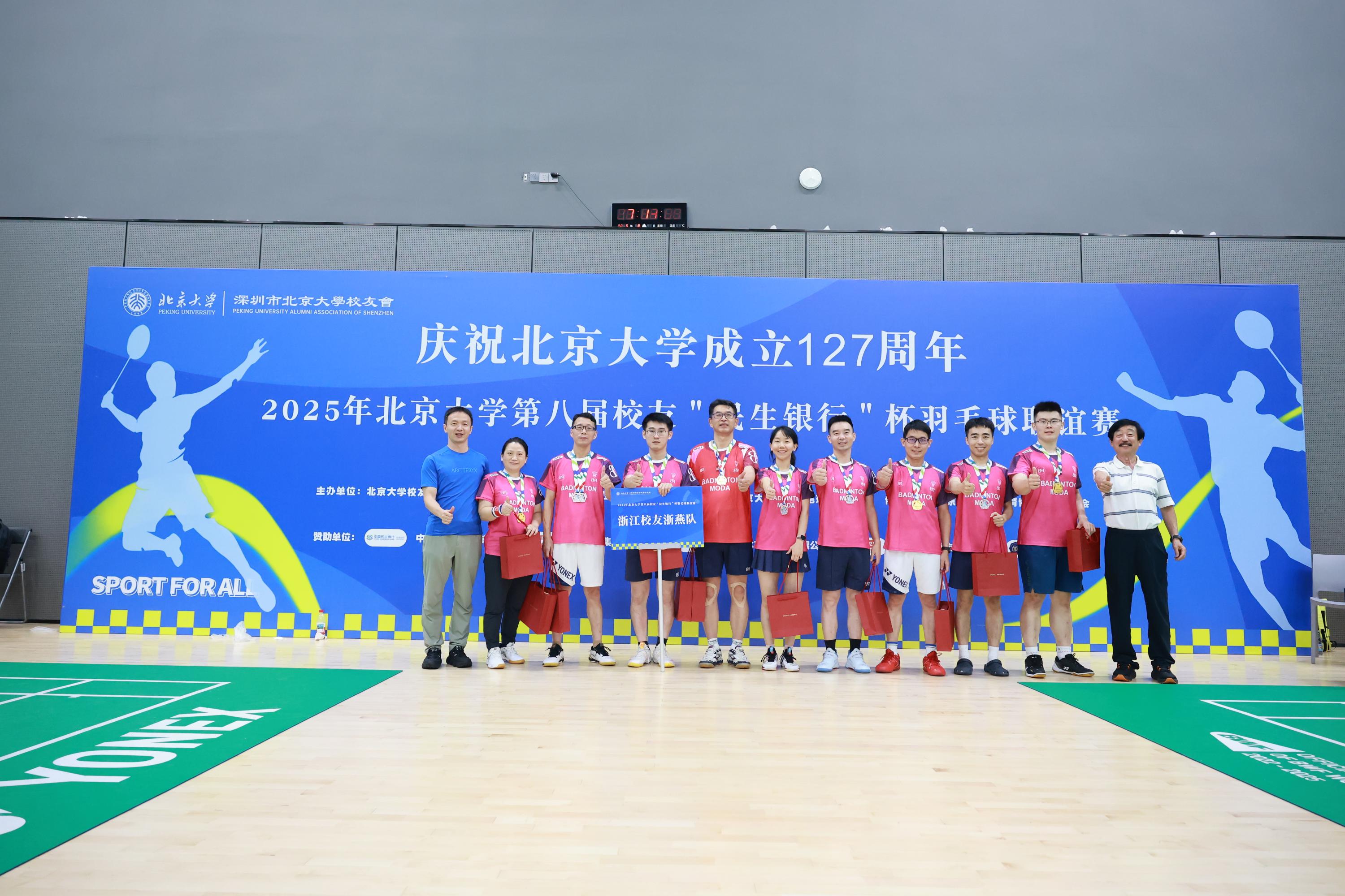 经过数轮激烈角逐,最终浙江校友“浙燕队”发挥稳定,摘得桂冠,深圳“鹏城飞羽二队”与“鹏城飞羽一队”分获亚军和季军。在“110岁双打”项目中,校友沈越、董欢军斩获第一名,徐风、杨家华和金明、张志祥分获第二、三名。赛后,肖军会长、李志贵秘书长及民生银行代表为获奖团队和个人颁奖,并合影留念,送上祝贺与期许,详细参见成绩册。