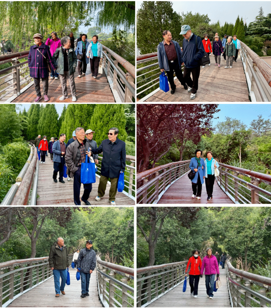 活动中,老校友们结伴而行,漫步于公园小径。此时秋光正好,园内绿意未褪、秋色初染。考虑到校友们的年纪,活动原本只安排在平路上缓步行走,然而时值九九重阳节,几位年近八旬的管国生等校友却精神矍铄地倡议道:“登高望远是九九重阳节的传统,我们这个年纪虽不能登山,何不将这生态栈桥作为我们今日的‘高山’,一同登桥远眺,一览泉城盛景,为聚会增添一份独特的仪式感!”这一提议,为活动注入了浓厚的仪式感,瞬间点燃了校友们的热情。连87岁的吴洪若老校友也欣然同行,将这次栈桥之行视为一次心灵的登高,全程参与,以步履致敬岁月。