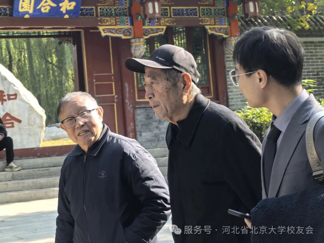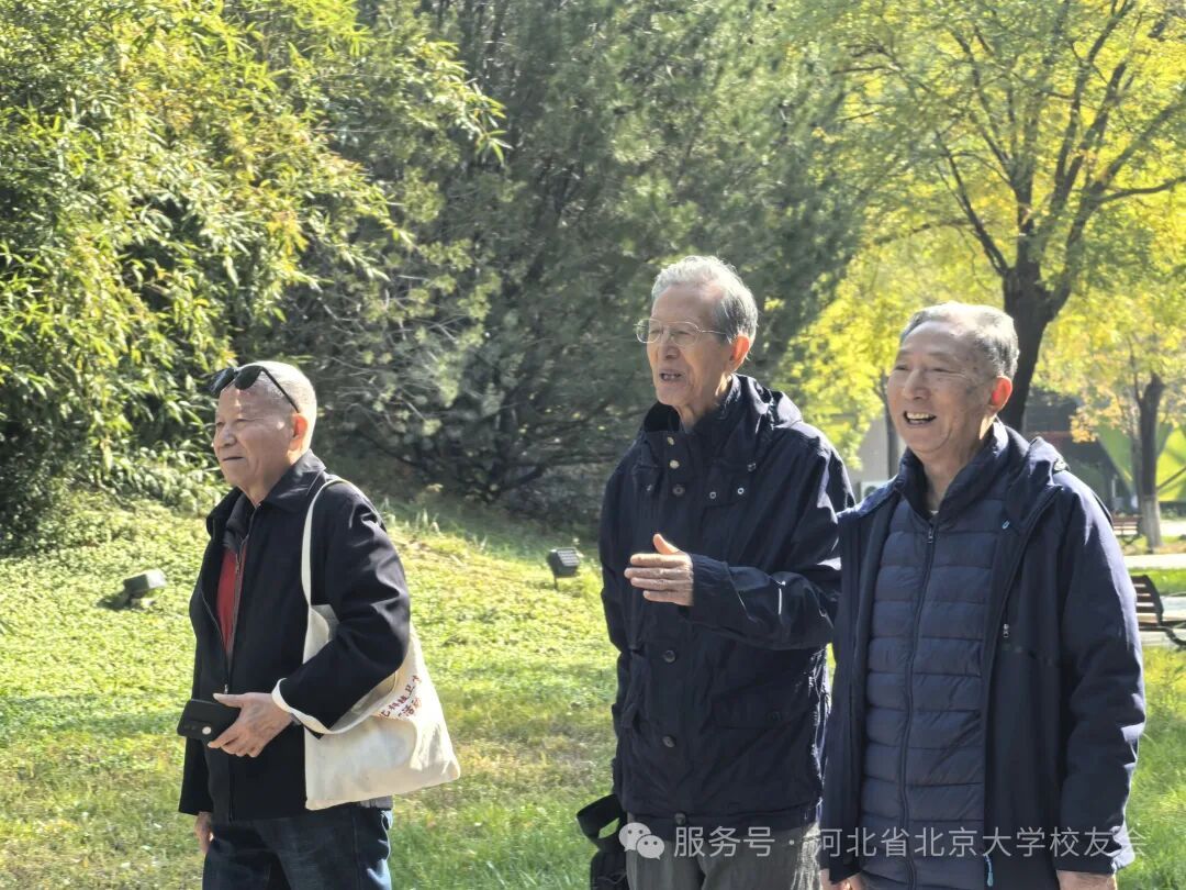 活动当日,秋光正好,微风不燥。正定园博园,这座集南北园林艺术之大成的园区,此时正秋意浓烈——绿树叠嶂间点缀着红黄秋叶,亭台楼阁映着粼粼湖水,与老学长们记忆中的燕园秋景相映成趣。老学长们难掩重逢的喜悦,不时追忆燕园求学时光,聊起当年在未名湖赏秋、博雅塔下谈心的片段,镜头定格下一张张满含笑意的脸庞。结伴漫步园区中,有的驻足欣赏秋日景致,有的与老友并肩闲谈,阳光透过枝叶洒在身上,暖意与情谊交织,尽显岁月静好。