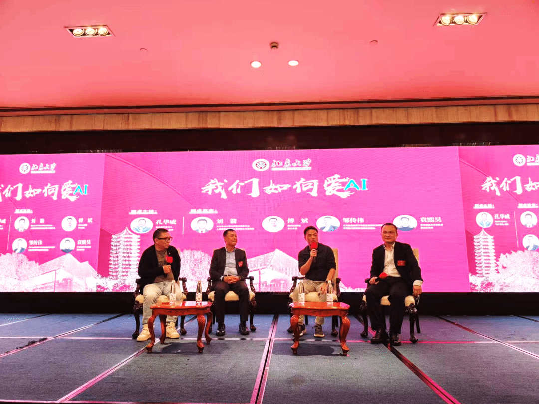 圆桌论坛邀请了北大物理系孔华威、北大光华EMBA刘箭、北大数学科学学院邹传伟、北大信息科技傅斌等四位校友,就“我们如何爱AI”主题进行讨交流。