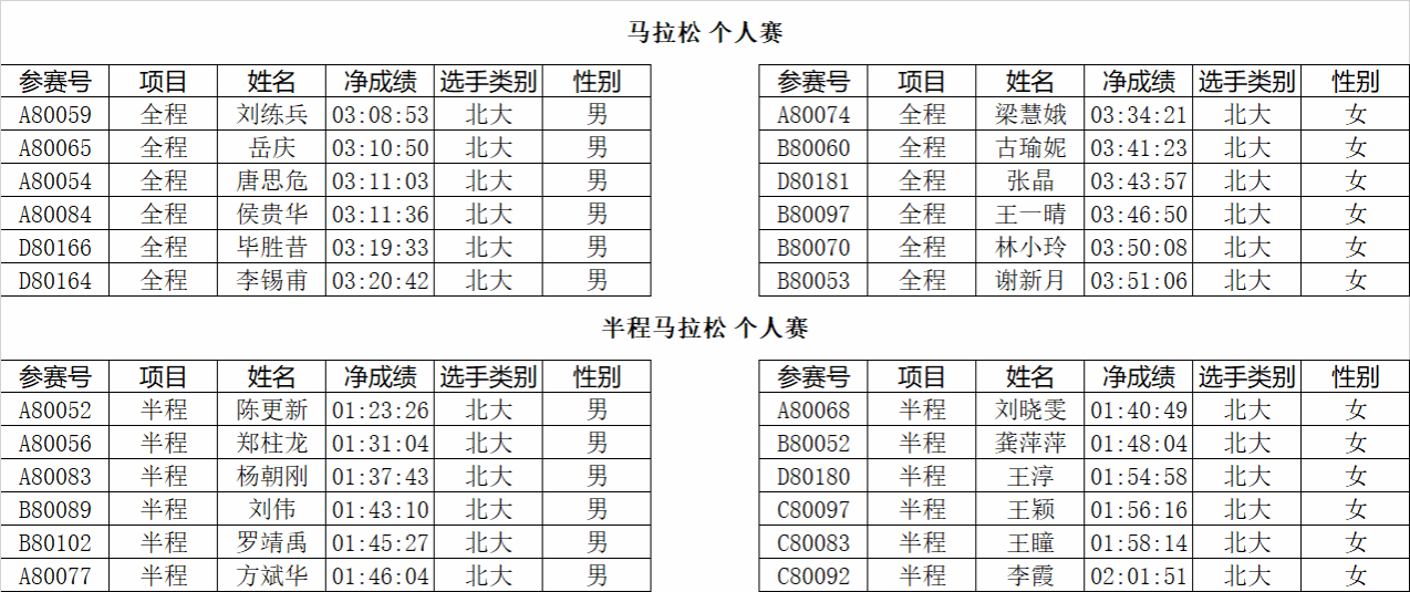 历经赛道上的速度与耐力角逐,各单项与团体赛事的获奖名单正式揭晓。马拉松男子组个人前六名分别是刘练兵、岳庆、唐思危、侯贵华、华胜昔、李锡甫,马拉松女子组个人前六名分别是梁慧娥、古瑜妮、张晶、王一晴、林小玲、谢新月。半马男子组个人前六分别是陈更新、郑柱龙、杨朝刚、刘伟、罗靖禹、方斌华,半马女子组前六名分别是刘晓雯、龚萍萍、王淳、王颖、王瞳、李霞。