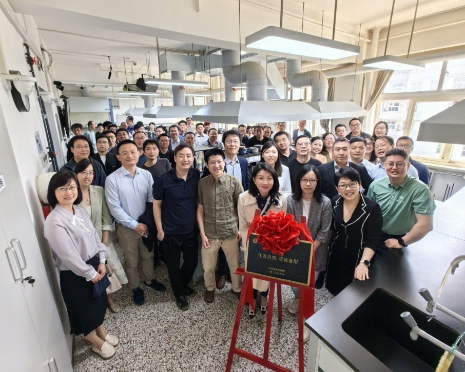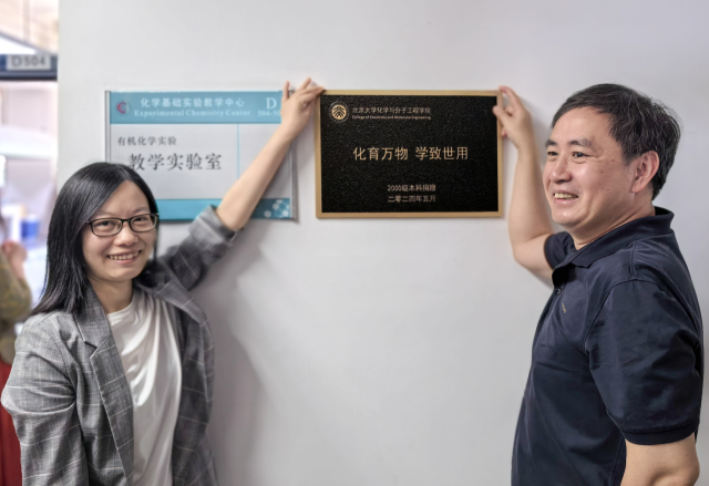 随后,校友们移步捐赠纪念墙合影。捐款校友代表周蓉与裴坚书记一同为D区504/506有机化学实验室挂牌。本次共有77位2000级校友参与D区有机化学实验室的捐赠,共筹款62.1万元人民币。未来将会有源源不断的北大化学人在这个实验室里成长学习,承星星之火,代代相传。