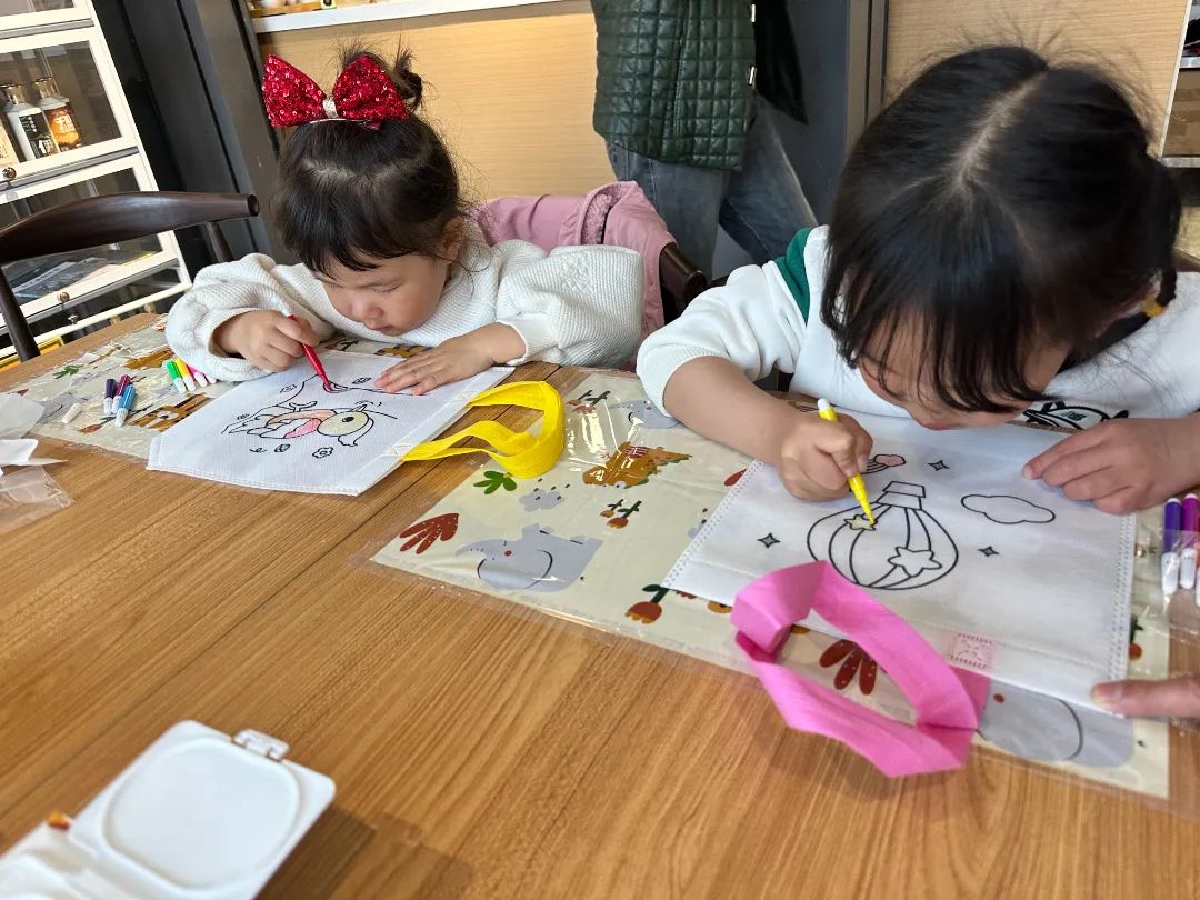 除了烘焙制作,南京校友会还特别为每一位小朋友准备了可涂鸦的无纺布手拎袋,小朋友们在等待糯米船烘烤时,可以发挥想象进行水彩涂鸦。