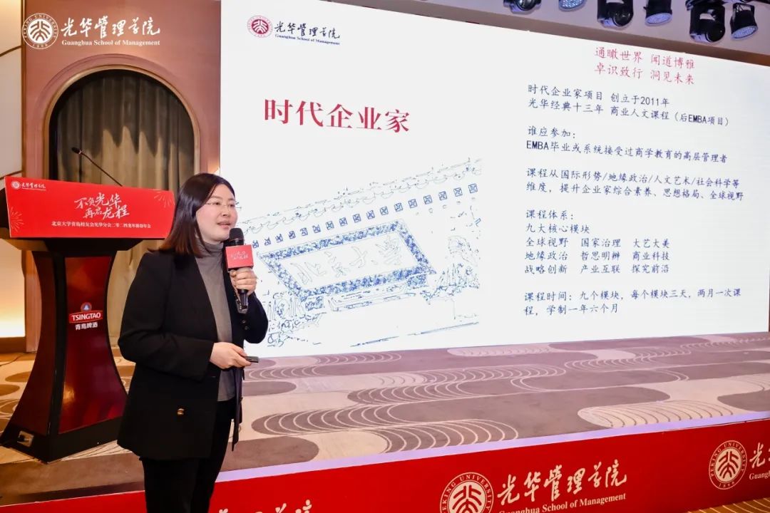 高妍介绍后EMBA“时代企业家”项目,该项目涉及政治、商业、人文、科技、艺术等九大课程模块,为校友们提供了一个人文同道、相互砥砺的新学习平台。