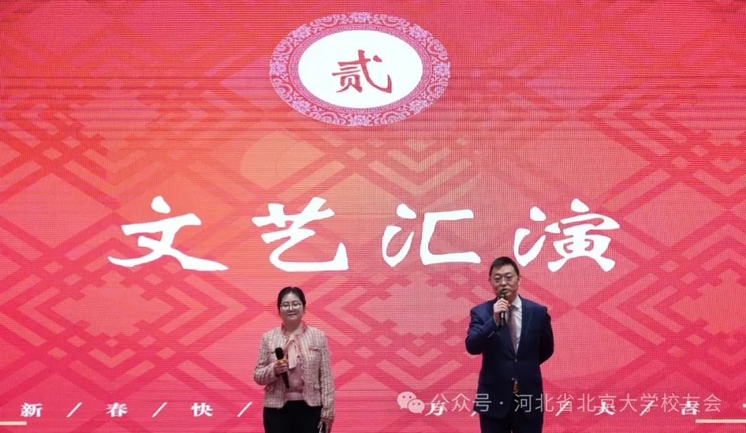 在新春团拜会文艺汇演环节,2023届选调生校友王紫莹、2009届校友张海水担任主持。2023届新生代表表演朗诵,医学部校友联合石家庄秀场舞团表演拉丁舞、大合唱,校友企业则表演非物质文化遗产“变脸”,节目精彩纷呈。