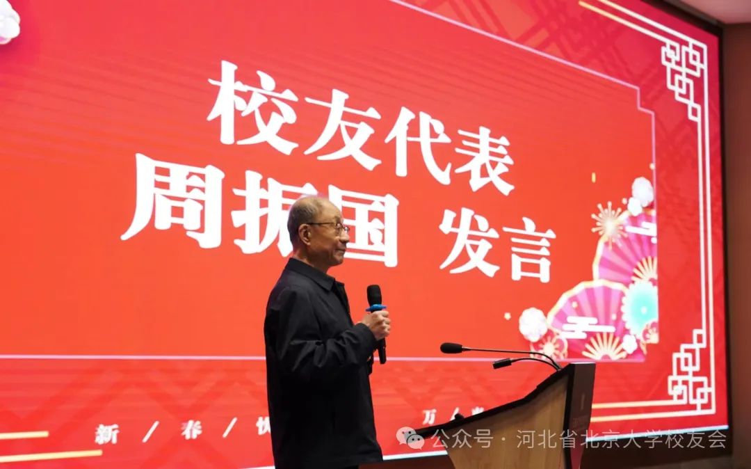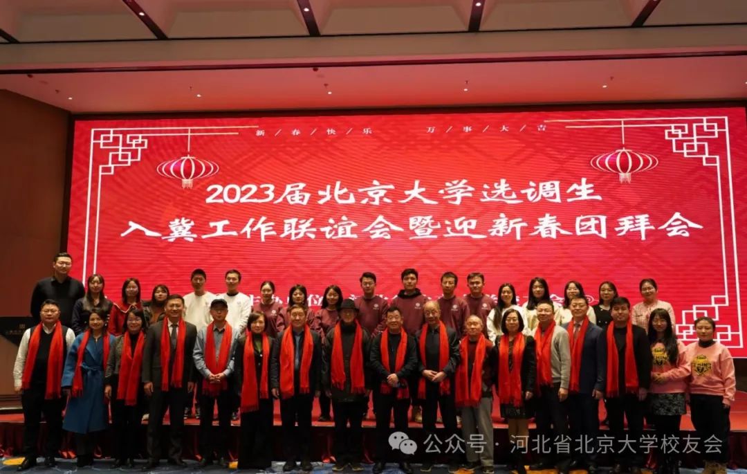 2024年1月28日,河北省北京大学校友会在北京大学经济学院石家庄教育科研基地举行2023届北大选调生入冀工作联谊会暨迎新春团拜会,100余名新老校友欢聚一堂,分享工作经验,共叙校友情谊,同迎新春佳节。河北省北京大学校友会(以下简称:河北校友会)会长吴路军,无极县委、县政府相关人员、2023届北大选调生,以及周振国、李文学、成少安等多位在冀工作校友出席此次活动。