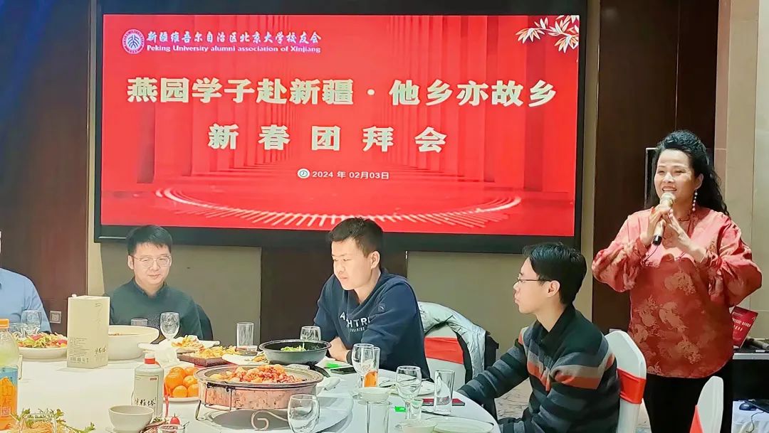 2024年2月3日,新疆维吾尔自治区北京大学校友会(以下简称:新疆校友会)在乌鲁木齐海通五星大饭店举办“燕园学子赴新疆·他乡亦故乡”新春团拜会。新疆校友会常务副会长兼秘书长罗英、名誉会长张野、副会长兼人事部部长马迎春、副秘书长兼宣传部部长阿依努尔·卡马、顾问李忠禄、艺术团指导黄俊萍,校友朱大庆、董向东,及13位2023届校友出席此次活动。活动由阿依努尔·卡马主持。