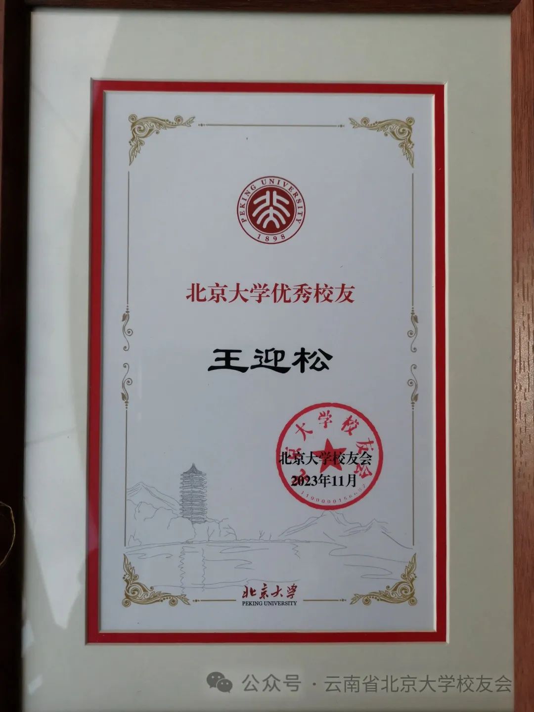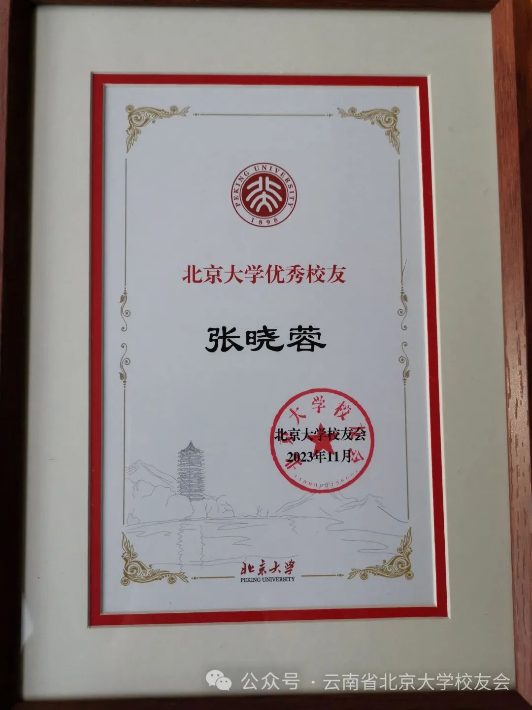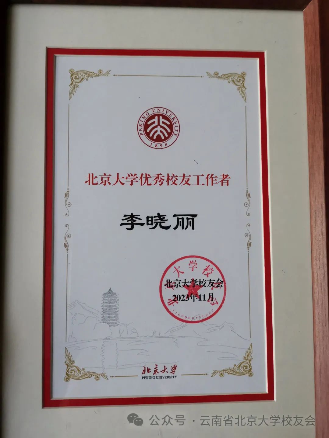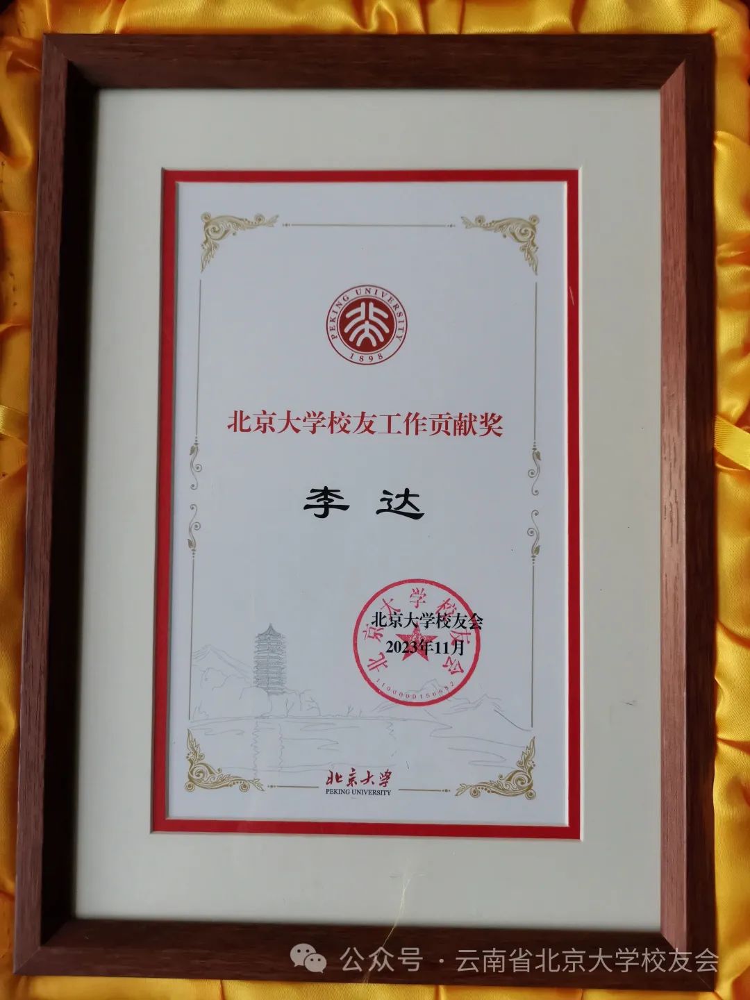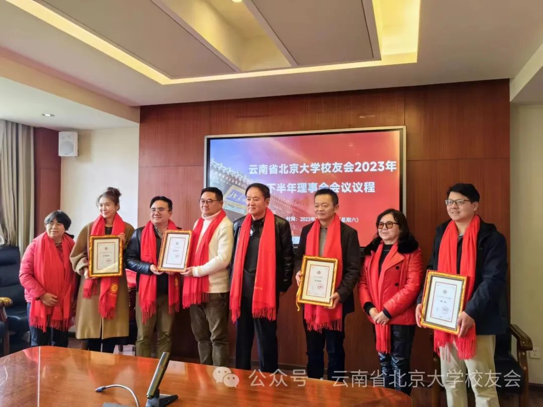 会议第六项,云南校友会领导为2023年作出积极贡献并获得北京大学校友总会表彰的四位校友颁发获奖证书。其中李达获北京大学工作贡献奖,王迎松、张晓蓉获北京大学优秀校友奖,李晓丽获北京大学优秀校友工作者奖。