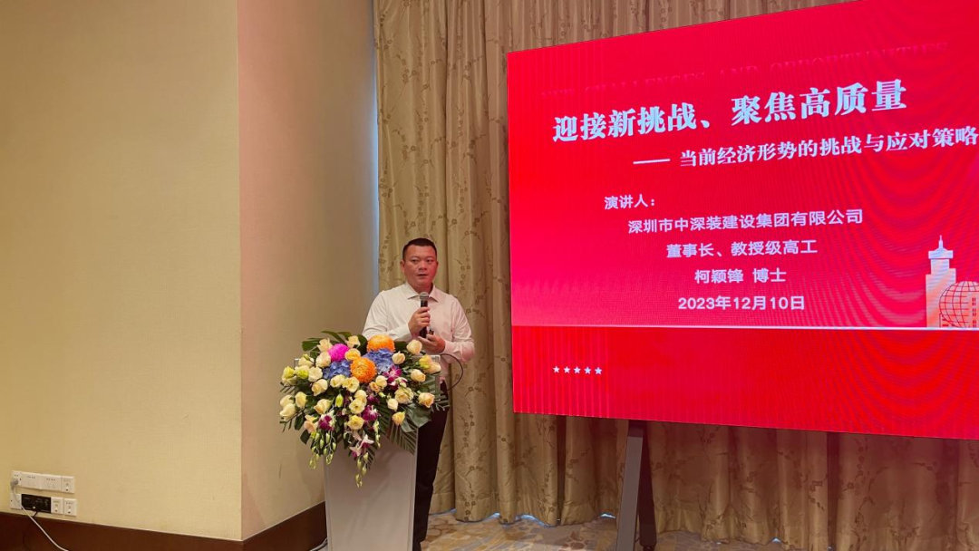 接下来是优秀校友企业分享环节,国发院的校友中除了有非常多的金融从业者外,还有更多优秀的企业家,国发院分会联席会长、中深装董事长工柯颖锋博士便是其中的一位。现场他带来了《迎接新挑战、聚焦高质量——当前经济形式的挑战与应对策略》的主题分享,向与会嘉宾介绍了中深装集团高质量发展的探索与经验,带给我们诸多思考与感悟。