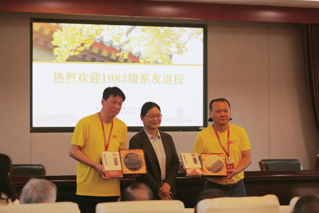 贺桂梅对1983级系友表示热烈欢迎,并介绍了中文系近年来在教学科研、学科建设、系友工作等方面的情况。贺桂梅代表中文系向83级系友赠送入学40周年纪念礼物。
