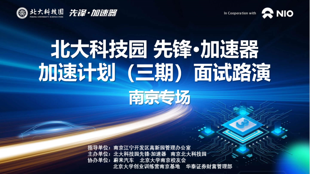 本次活动在江宁开发区高新园管办的指导下,由北大科技园先锋·加速器携手北京大学南京校友会、南京北大科技园、蔚来汽车等合作伙伴,为拟入营“先锋·加速器三期加速计划”的企业提供链接产业资源、资本的平台,寻找优秀创新创业项目。