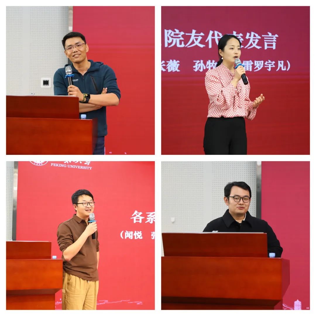 教师发言完毕后,返校校友代表也分享了此次回校感想。力学系校友闻悦感慨毕业后时光匆匆,十年后的现在能够与大家重逢,是幸运和美好的,希望大家珍惜当下,真挚的同学友谊常在。能源系校友张薇首先表达了对学院长期关心、支持校友发展的感激之情,并根据自身的发展历程表达了国家对于能源行业的重视,勉励大家在各自岗位上兢兢业业,为国家发展贡献力量。生医系校友孙牧旸回顾了曾在北大学习和工作的情况,希望学院能够利用好新奥工学大楼落成使用的契机,通过开展丰富的活动服务校友,巩固校友间的深厚情谊。工程系校友雷罗宇凡简要总结了美好的北大回忆,以及重逢的喜悦之情,并再次对学院和老师们的培养及教导表示感谢。除了到场的同学们,海外校友也送上了来自地球另一端的祝福,温馨的视频让在座的师生们感动不已,掌声不断。