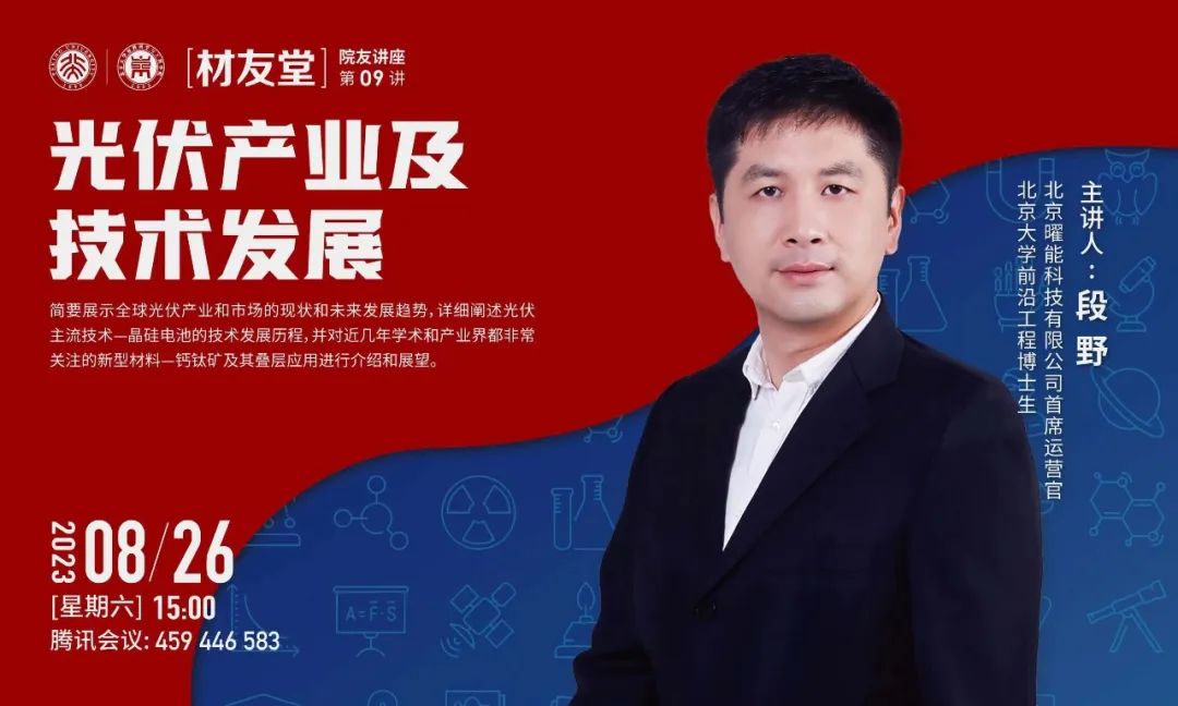2023年8月26日下午,“材友堂”院友讲座第九讲在线上举行。北京曜能科技有限公司首席运营官、北京大学前沿工程博士生段野为大家带来“光伏产业及技术发展”主题报告,报告由北京大学材料科学与工程学院吕爽老师主持,共40余人参与。
