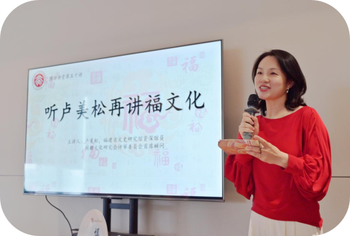 讲座由北京大学法学院校友陈思宇主持。陈思宇从去年9月24日卢美松校友在博雅讲堂上讲的《福文化溯源》开始,一直到23日晚上杭州亚运会开幕式上“蟾宫折桂”等精彩表演,说明了中华民族追求幸福、创造幸福的悠久文化传承和福文化的丰富内涵。在福建北大人之家乔迁新址和博雅讲堂开办五十期之际,请卢美松校友为校友们再讲福文化,是一件特别有意义的活动。