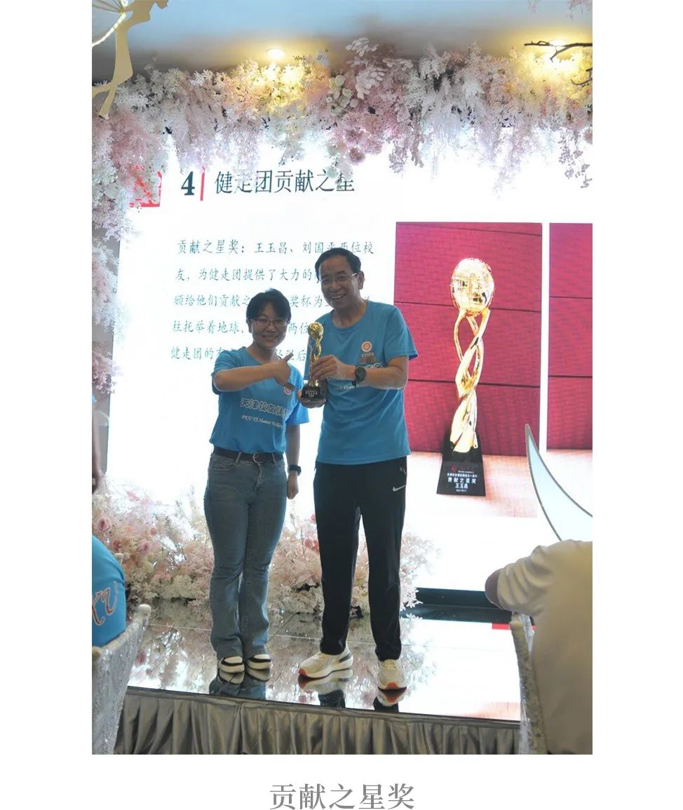 第三个是“贡献之星”,健走团全体成员特别感谢王玉昌、刘国平两位校友为健走团提供的财务支持。奖杯为三根螺旋柱托举着地球,象征着两位校友是健走团的有力支撑和坚强后盾。王玉昌坦言,健走团一路成长离不开各位校友的支持——有团长魏秋霞的事无巨细、尽心尽力,还有始终坚持健走的校友们,足迹遍布大江南北。最后,他结合自身经历,盛赞健走带来的益处,并鼓励大家坚持健走锻炼,永葆青春活力。