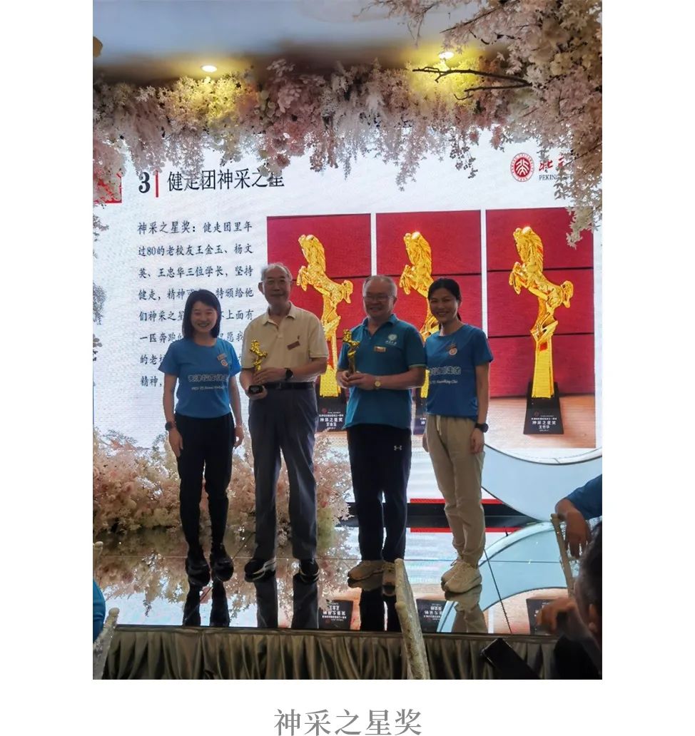 第二个是“神采之星”,颁给健走团里80高龄的三位学长,分别是:王金玉、杨文英、王忠华。学长们坚持健走,精神可嘉。“神采之星”的奖杯是一匹奔跑腾跃的骏马,王金玉拿着奖杯,笑言:“我终于知道什么是梦想成真了,晚上做梦希望能得金马奖,现在就捧在手里了。”王忠华讲述了自己在大学时是班里身体最差的学生,这么多年一直坚持锻炼,现在可以说是身体最好的学生。他鼓励校友们,坚持锻炼一定大有裨益。