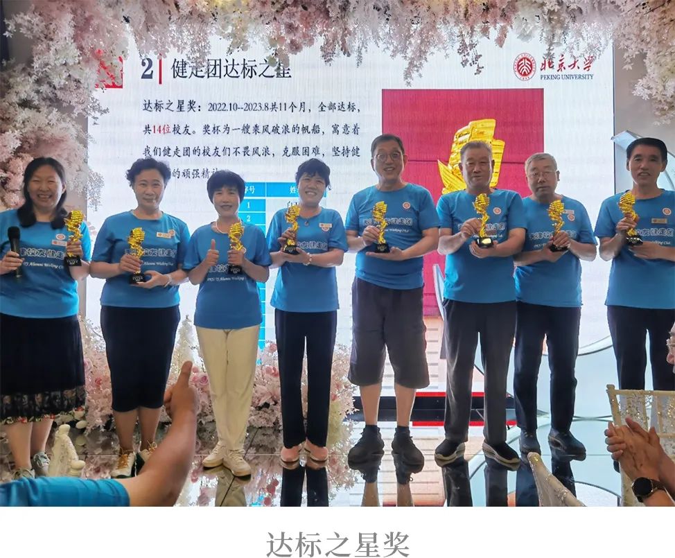 紧接着颁发三大奖项。第一个是“达标之星”,鼓励从2022年10月至2023年8月期间,全部考核达标的14位校友。奖杯为一艘乘风破浪的帆船,寓意着健走团的校友们不畏风浪,克服困难,坚持健走运动的顽强精神。校友马富春作为“达标之星”代表发言,他直言在健走团参加活动是一种享受,这里有家的温暖。