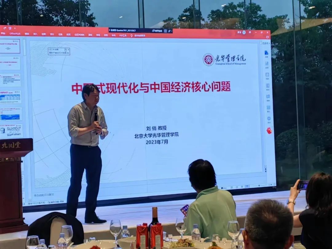 会上,刘俏作《中国式现代化和中国经济核心问题》主题分享,围绕“中国经济增长的空间有多大”“为什么要保持高强度且适度超前的投资”等内容进行阐述。徐兵作北大光华江苏校友的具体情况汇报,并作为代表接受刘俏院长赠送的礼物。