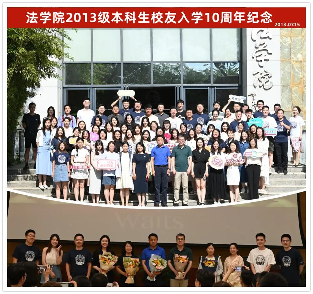 2023年7月15日下午,北京大学法学院2013级本科校友入学10周年纪念活动于凯原楼报告厅顺利举办。北京大学法学院副院长车浩,党委副书记路姜男,王锡锌教授,校友工作办公室主任党淑平、副主任鲁昕鑫,法学院国内合作办公室副主任、时任2013级二班班主任贾薇薇和2013级本科生校友及亲属70余人参加活动。李越校友担任活动主持人。