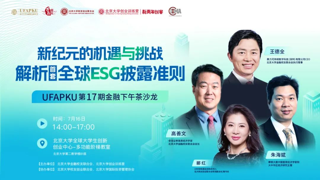 本次活动主题是《新纪元的机遇与挑战——解析首套全球ESG披露准则》,邀请鼎力可持续数字科技(深圳)有限公司CEO、北京大学金融校友联合会执行理事王德全,安信证券首席经济学家、北京大学金融校友联合会会长高善文现场点评,以及摩根大通中国首席经济学家和大中华区经济研究主管、北京大学1989级信息管理系本科校友朱海斌线上点评。北京大学校友创业联合会常务副会长兼秘书长、1898创投创始合伙人郦红主持活动。